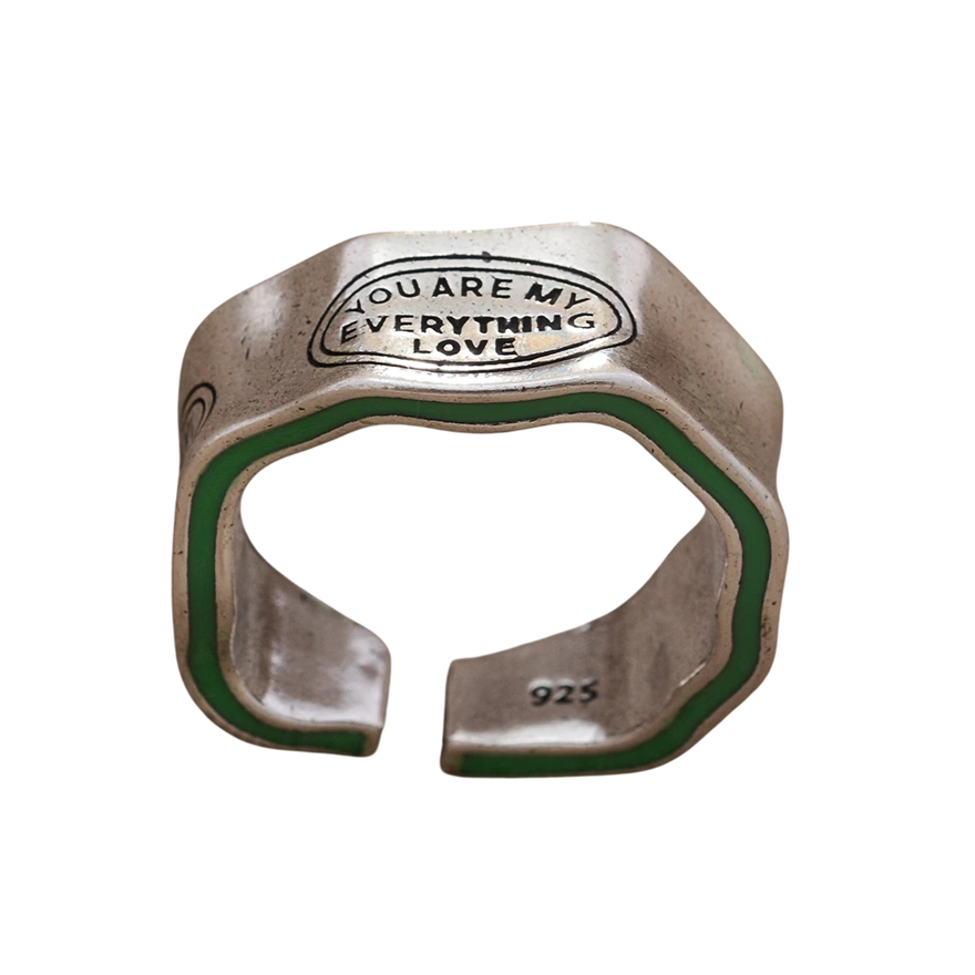 Stylowy regulowany pierścionek z romantycznym napisem z wysokiej jakości żywicy w zielono-srebrnym wykonaniu. Nowoczesny dodatek do codziennego noszenia i na prezent. Pełny opis