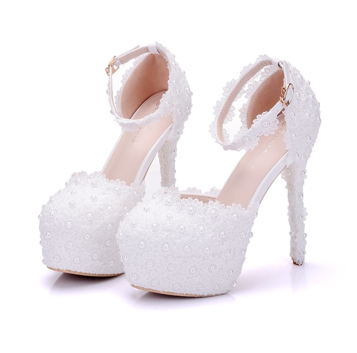 Ubierz się elegancko na wesele z tymi koronkowymi pompkami. Ldoičky są ozdobione perłami.