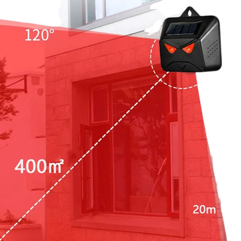 Ultradźwiękowy odstraszacz szkodników z czerwonymi diodami LED 20 m zasięg 120° kąt Panel słoneczny bateria litowa czarna do ogrodu Ultradźwiękowy odstraszacz szkodników to skuteczne urządzenie do ochrony ogrodów, podwórek i przestrzeni zewnętrznych przed nieprzyjemnymi szkodnikami. Dzięki