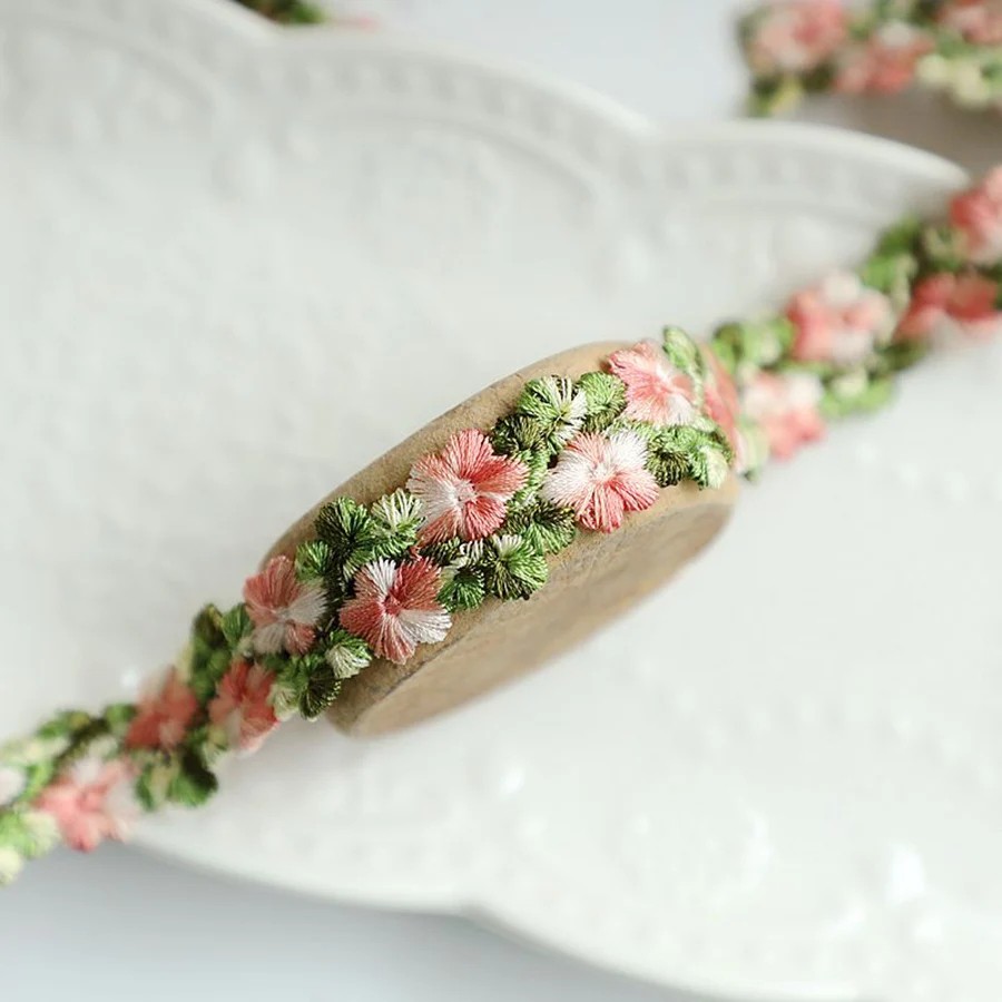 Delikatna wyhaftowana koronkowa wstążka z kwiatowym motywem odpowiednia do szycia, ozdabiania odzieży, dekoracji ślubnych oraz kreatywnych projektów DIY. Pełny opis