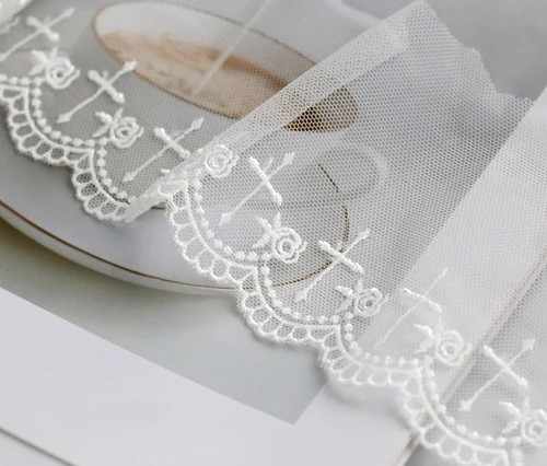 - Wyhaftowana siatkowa koronka w wzór krzyżyków do dekoracyjnego szycia