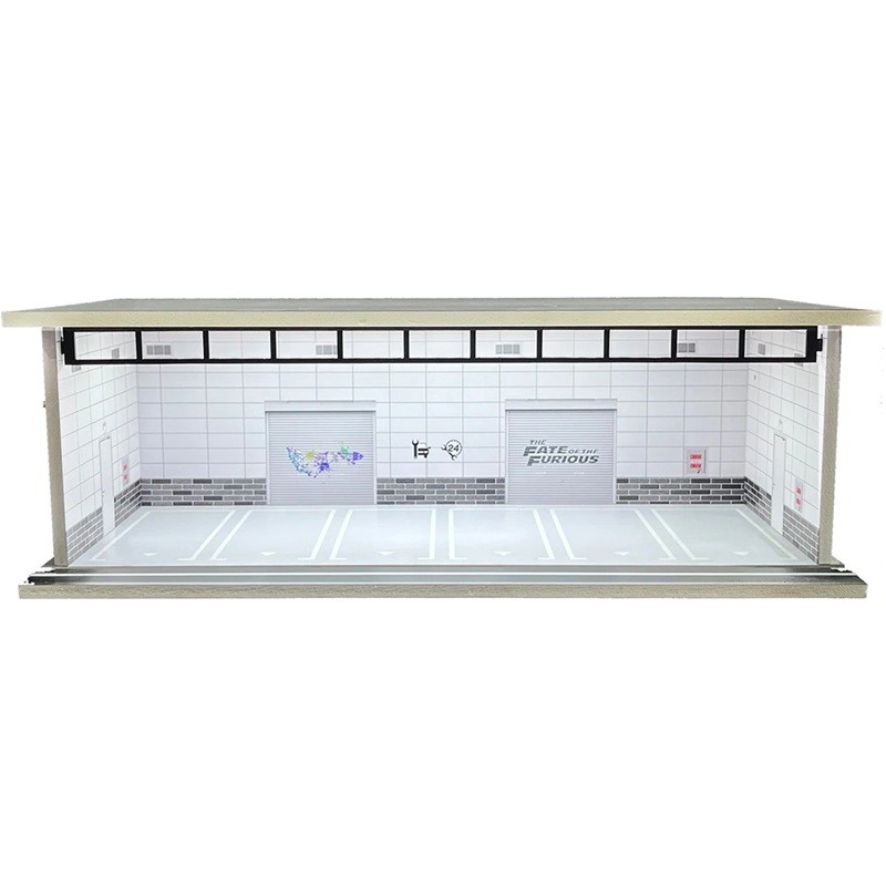 Wystawne dioráma garaż dla modeli aut 30 x 13,5 x 10 cm Skala 1:64 Jasna biała kafelkowa hala z napisami i garażowymi drzwiami