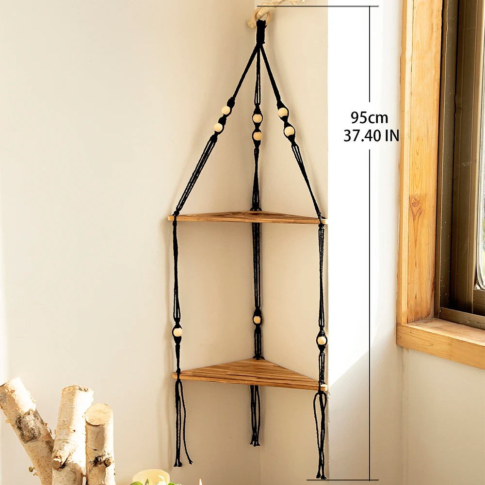 Zawieszona narożna półka w dwuetapowej wersji umożliwia efektywne wykorzystanie przestrzeni w rogu pomieszczenia. Szerokość przedniej krawędzi wynosi 32,5 cm, wymiar boczny to około 23,5 cm, a całkowita wysokość zawieszenia wynosi około 93 cm. Półka jest zawieszona na czarnym sznurku z ozdobnymi koralikami. Dwie powierzchnie do przechowywania zapewniają więcej miejsca na dekoracje i drobne przedmioty. Odpowiednia jest dla lżejszych dodatków i dekoracji wnętrz.