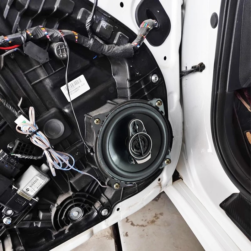 - Instrukcja montażu: zakryj wnętrze materiałem ochronnym, zdejmij tapicerkę drzwi, odłącz oryginalny głośnik, zamocuj uchwyt/uszczelkę, podłącz przewody do zacisków, przykręć głośnik, nałóż siatkę i załóż z powrotem tapicerkę