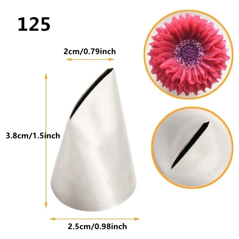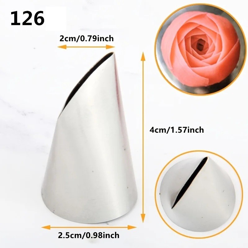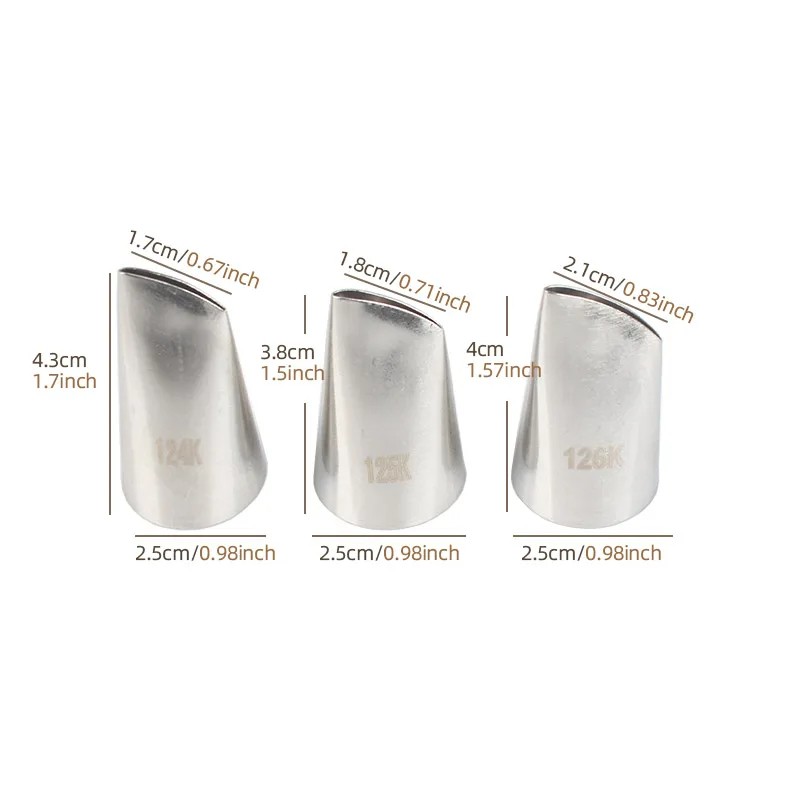 Oznaczenia 124K, 125K i 126K nie są wymiarami, lecz kodami typu kształtu, które są powszechnie stosowane w cukiernictwie. Końcówka 124K tworzy szersze płatki i warstwowe kwiaty odpowiednie do większych dekoracji. Końcówka 125K jest idealna do średnio szerokich i wyrazistych płatków, na przykład w kwiatach piwonii. Końcówka 126K ma węższe wyjście i pozwala na stworzenie delikatnych, precyzyjnych i szczegółowych płatków, które wyglądają bardzo realistycznie nawet w małej skali. Połączenie tych trzech końcówek znacznie rozszerza możliwości dekorowania i pozwala na tworzenie kwiatów pełnych głębi i struktury.