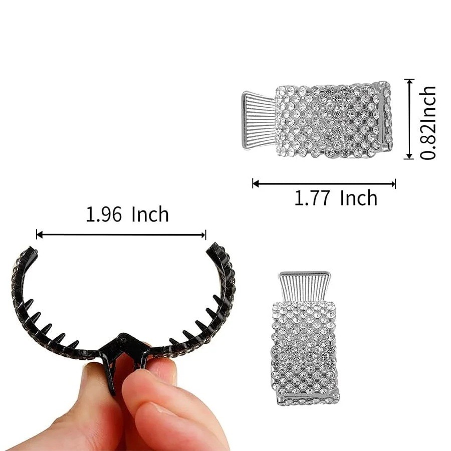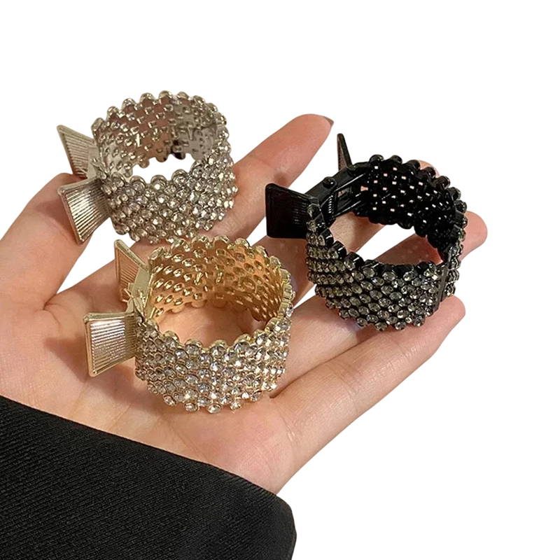 Elegancki zestaw mini klipsów do włosów wykonany jest z metalu i ozdobiony gęsto osadzonymi błyszczącymi kamieniami, które nadają fryzurze luksusowy i wyrazisty wygląd. Zaokrąglony kształt został zaprojektowany tak, aby wygodnie obejmował wysoki kucyk i mocno go utrzymywał. Błyszcząca powierzchnia pięknie odbija światło, tworząc efekt biżuterii we włosach. Dzięki kompaktowym rozmiarom klips wygląda elegancko, nie będąc zbyt wyrazistym.