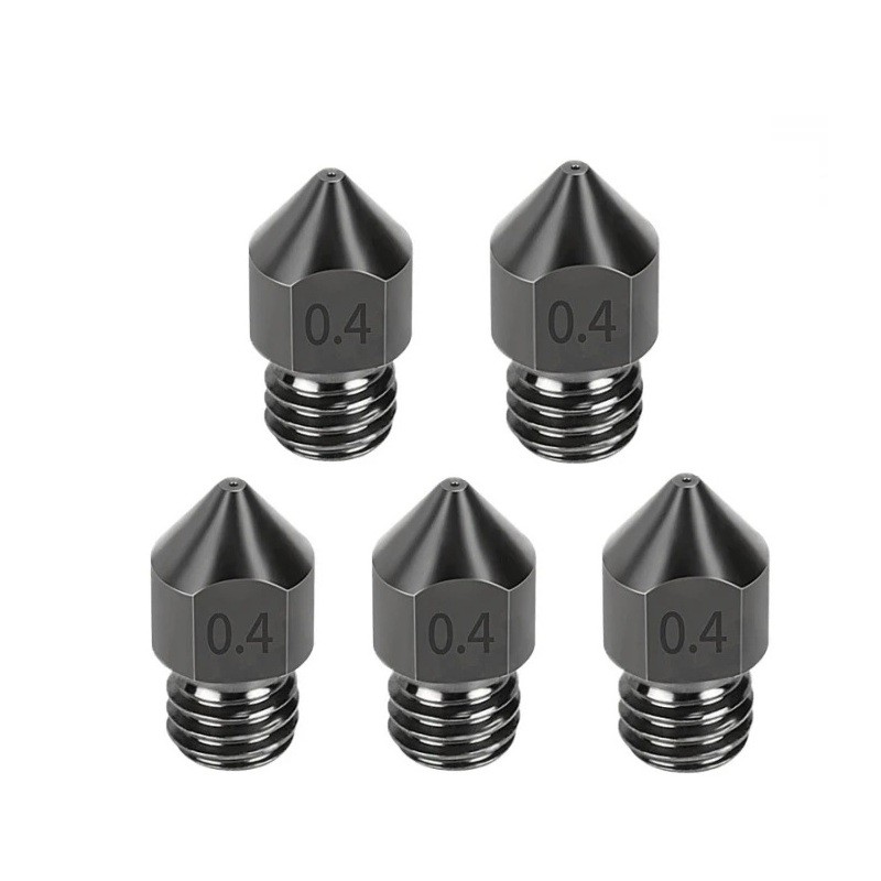 Zestaw 5 sztuk stalowych kalenych dysz 0,4 mm do filamentu 1,75 mm z gwintem M6 do druku precyzyjnych modeli 3D