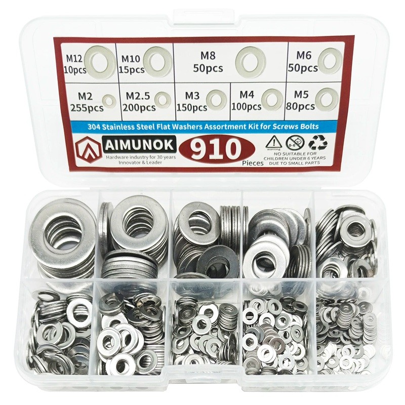 Zestaw 910 sztuk płaskich podkładek ze stali nierdzewnej 304 M2–M12 do śrub i nakrętek Do warsztatu i zastosowań przemysłowych