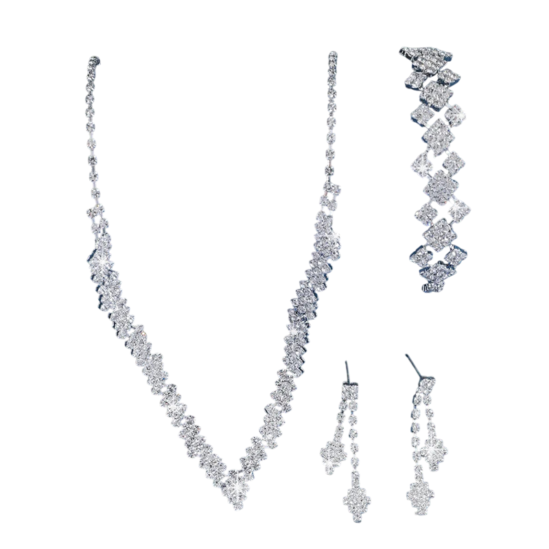 Taki elegancki zestaw biżuterii z kryształami w kształcie V został zaprojektowany dla kobiet, które chcą zabłysnąć podczas wyjątkowych okazji. Delikatny blask kamieni dodaje stylizacji luksusowego charakteru i sprawia, że wygląda ona zarówno na sofistykowaną, jak i ponadczasową. Kształt V podkreśla dekolty i optycznie wydłuża szyję, co idealnie dopełnia suknię ślubną oraz wieczorową kreację. Zestaw tworzy harmonijną całość i podkreśla kobiecość bez zbędnej ostentacji. Dzięki starannemu wykonaniu oferuje nie tylko piękny wygląd, ale także komfort noszenia.