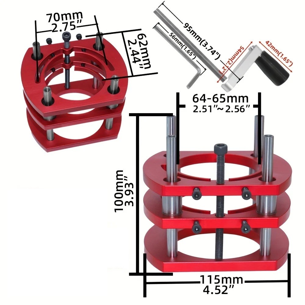 Płyta wkładowa ma wymiary 240 x 200 x 5 mm i jest gotowa do wbudowania w blat roboczy lub stół frezarski. Otwory montażowe o rozstawie 62 x 70 mm ułatwiają mocowanie kompatybilnych maszyn i akcesoriów. Mechanizm podnoszący umożliwia precyzyjne ustawienie i ma maksymalny skok 51 mm, dzięki czemu możesz wygodnie dostosować wysokość frezowania nawet przy powtarzających się operacjach. Konstrukcja jest zaprojektowana dla silników o średnicy 64–65 mm, co jest powszechnym rozmiarem w przypadku wielu frezarek górnych. Materiał to stop aluminium, co przyczynia się do precyzji i długowieczności przy standardowym użytkowaniu warsztatowym.