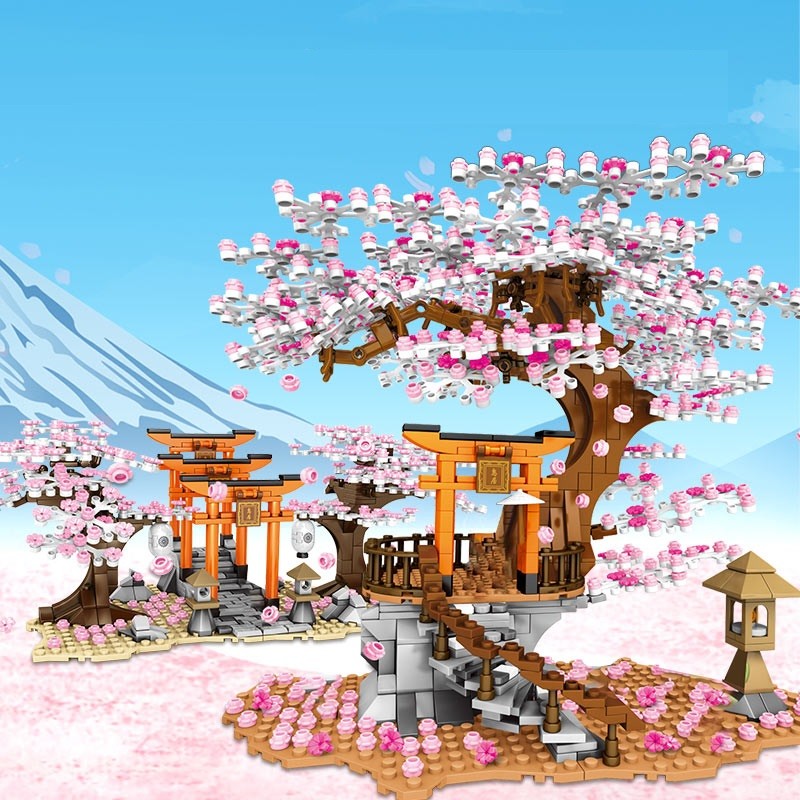 Dominantą całego modelu jest rozległa korona sakury, składająca się ze setek drobnych różowych kwiatów, które tworzą efekt delikatnie opadających płatków. Gałęzie są dopracowane tak, aby wyglądały naturalnie i dźwigały ciężar kwiatów, które tworzą bogaty baldachim nad drewnianą platformą i sanktuarium. Pod drzewem znajduje się starannie zbudowana podstawa łącząca elementy kamienne i drewniane, uzupełniona o eleganckie kręte schody prowadzące do domku. Ten jest inspirowany tradycyjną japońską architekturą – nie brakuje małego drewnianego balustrady, daszka z delikatnym zakrzywieniem ani subtelnych ornamentów. Po prawej stronie sceny stoi samodzielna japońska latarnia z typowym skośnym dachem, dopełniająca ogólną atmosferę spokoju i elegancji.