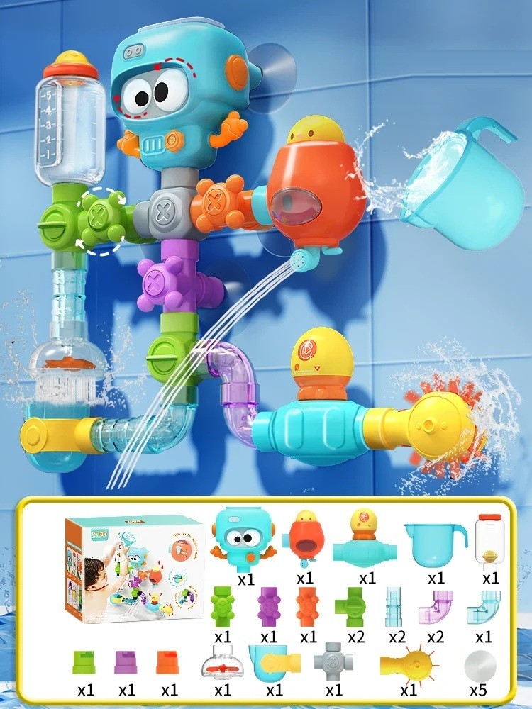 Taki zestaw wodny składający się z 27 elementów został zaprojektowany, aby każda kąpiel stała się zabawą w odkrywanie przepływu wody. Zestaw umożliwia nieograniczone składanie różnych kształtów i torów, a dzieci mogą tworzyć różnorodne konstrukcje wodne bezpośrednio na ścianie wanny. Wszystkie elementy trzymają się dzięki mocnym przyssawkom, które można umieścić na gładkich kafelkach lub ścianach wanny. Głównym elementem jest niebieska ośmiornica z dużymi oczami, które obracają się po uruchomieniu wody. Wraz z kolorowymi rurkami, kolanami, zaworami, prysznicami i obrotowymi elementami tworzy kompletny system wodny z wieloma efektami.