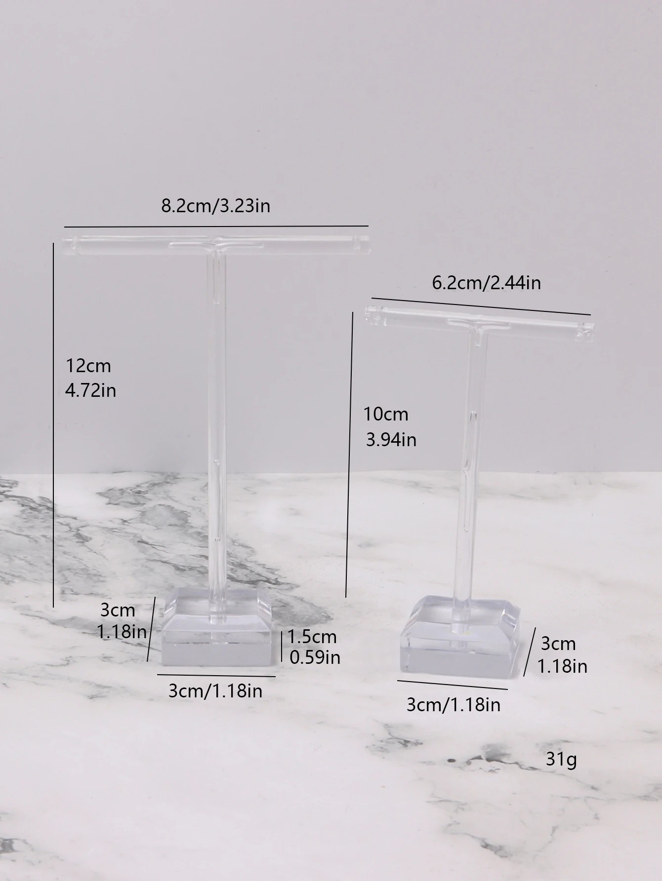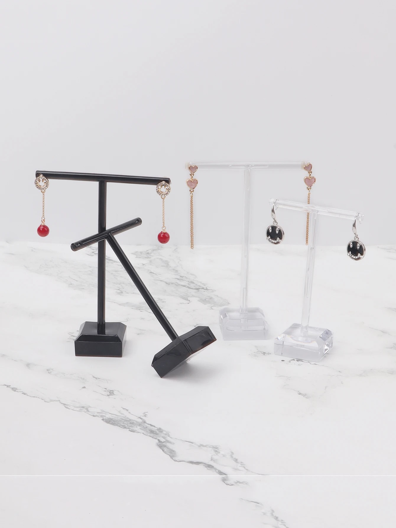 Kompaktowe uchwyty do wyeksponowania kolczyków na stole lub półce, prosta konstrukcja z podstawą odpowiednia do przejrzystego przechowywania biżuterii. Pełny opis