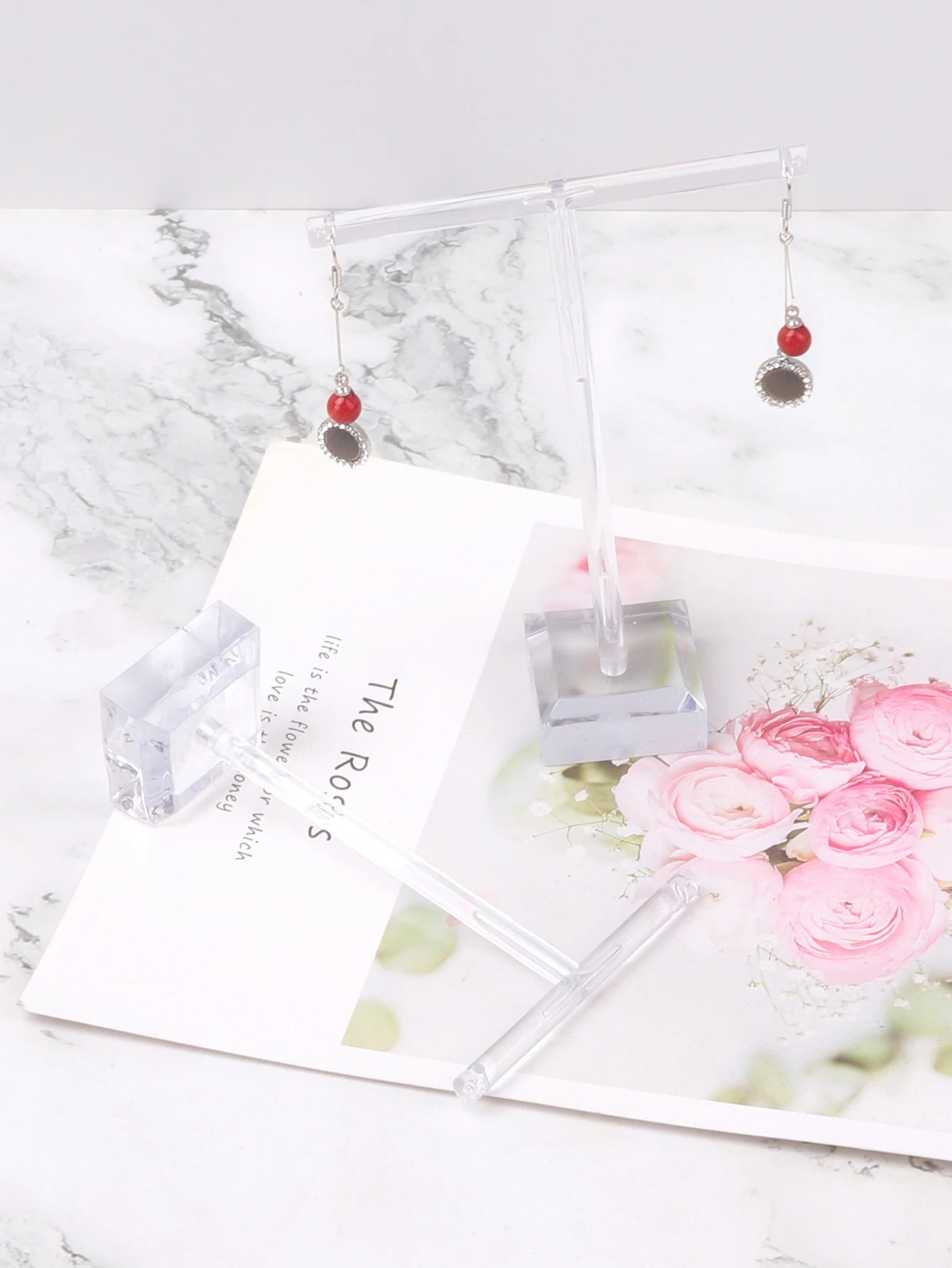 Przezroczysty akrylowy stojak na biżuterię został zaprojektowany do przejrzystego przechowywania kolczyków i drobnej biżuterii na stole lub półce. Konstrukcja z materiału akrylowego tworzy mocny i stabilny stojak odpowiedni do codziennego użytku. Podstawa składa się z lustrzanej podstawy, która umożliwia lepszy przegląd przechowywanych dodatków. Górna część wyposażona jest w kilka ramion, które mają mini haczyki i wycięcia do zawieszania różnych typów biżuterii. Dzięki kompaktowym wymiarom 15 × 6 × 11 cm stojak nadaje się również na mniejsze powierzchnie.
