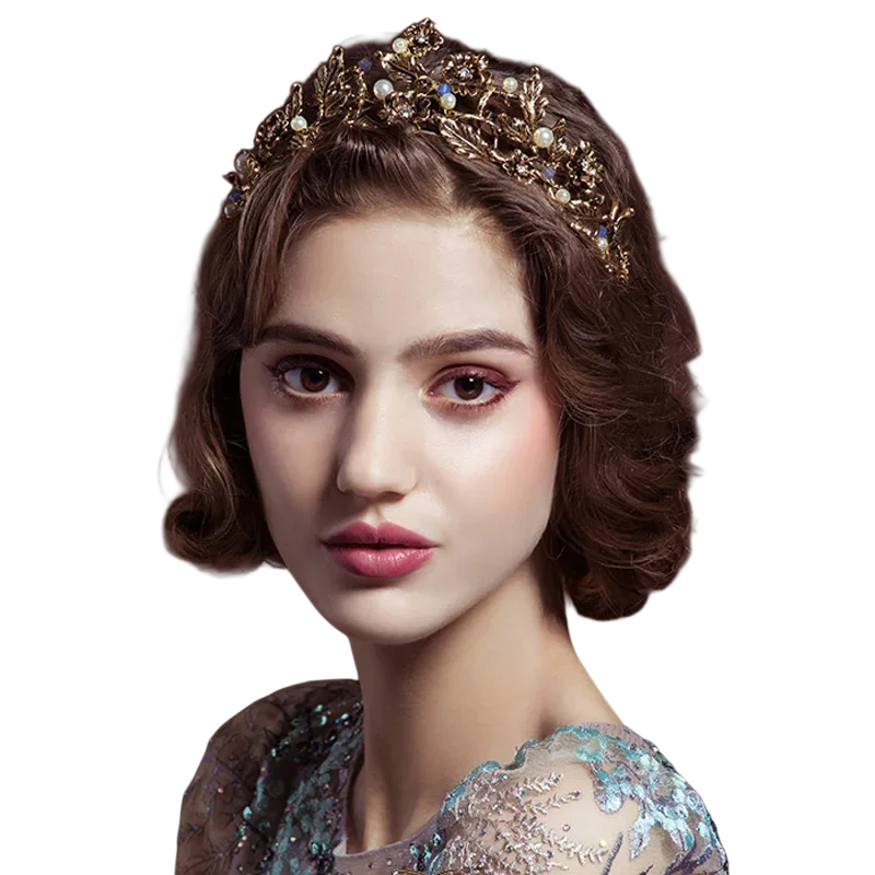 Elegancka ozdoba do włosów przyciąga uwagę delikatnym kwiatowym motywem uzupełnionym o liście i białe perły, które tworzą harmonijny i ponadczasowy wygląd. Złote wykończenie nadaje dodatku luksusowy charakter, a jednocześnie pozostaje gustowne i stonowane. Dzięki starannie dopracowanym detalom korona sprawia wrażenie lekkiej i przewiewnej, dzięki czemu pięknie uzupełnia różne typy fryzur. Lekka konstrukcja zapewnia komfort noszenia nawet przez dłuższy czas.
