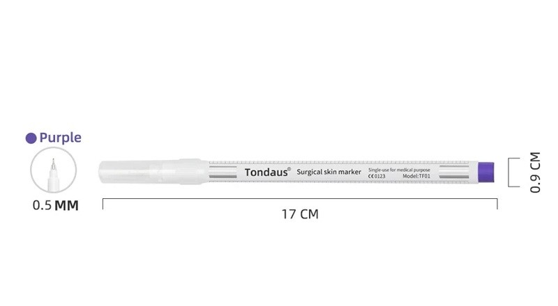 Fioletowy kolor zapewnia dobrą widoczność na skórze i ułatwia kontrolę kształtu podczas całej pracy. Konstrukcja długopisu jest lekka i ergonomiczna, co pozwala na wygodne trzymanie nawet przy dłuższym użytkowaniu. Aktualne wykonanie długopisu jest w fioletowym kolorze.  Kolor długopisu jest przeznaczony do tymczasowego oznaczania skóry i można go łatwo usunąć po użyciu zwykłymi środkami czyszczącymi przeznaczonymi do skóry.